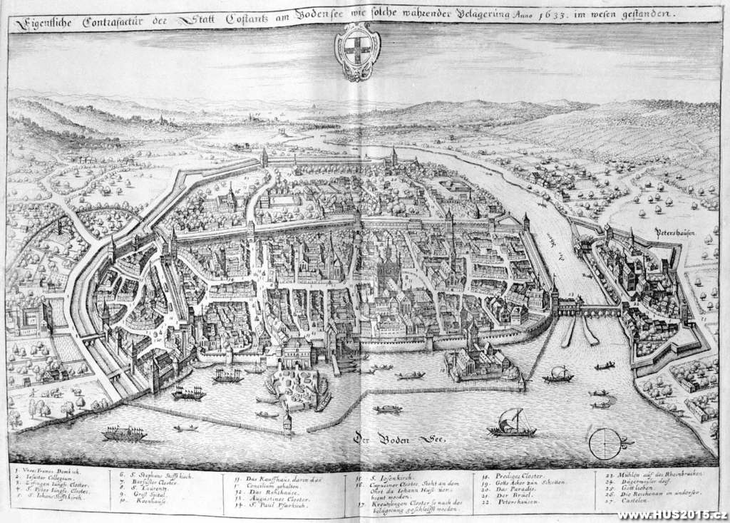 Historické vyobrazení města Konstanz (Kostnice) na pomezí Bavorska a Švýcarska. Kostnice leží u Bodamského jezera, které tvoří přírodní hranici mezi oběma zeměmi a Rakouskem. Zde se konal významný koncil, na němž byl Jan Hus odsouzen k smrti a upálen. Výstava Husinec - archiv autorů.